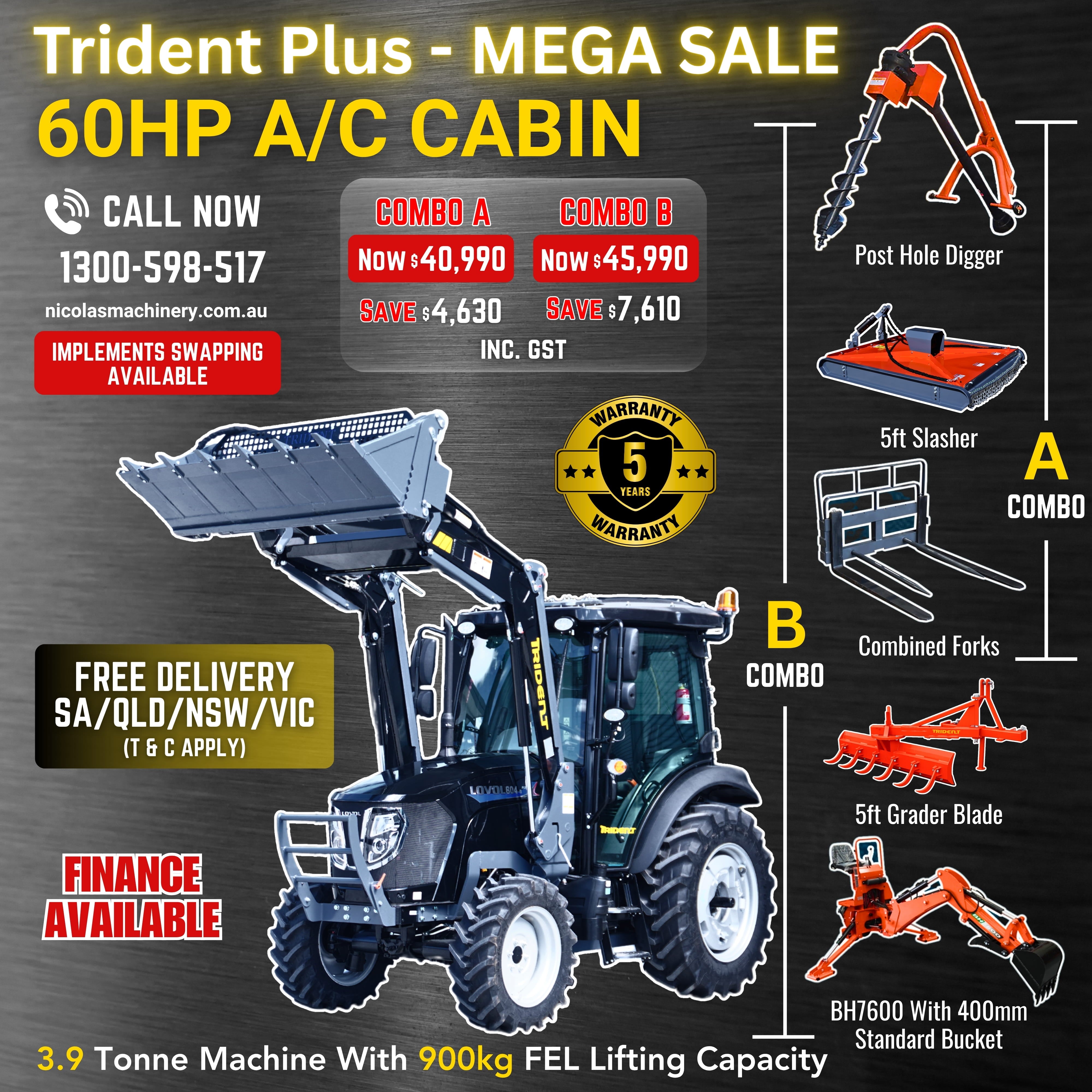 Save $2,000 on the Trident Plus 60HP A/C Cabin Tractor. Enjoy a 5-year labour and parts warranty and free delivery within 500 km across QLD/SA/NSW/VIC (T&Cs apply).
