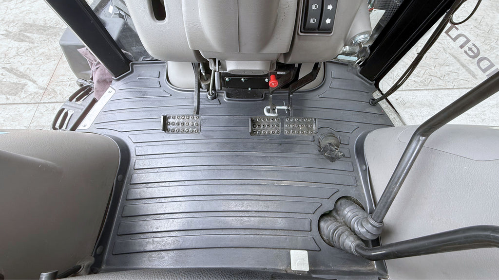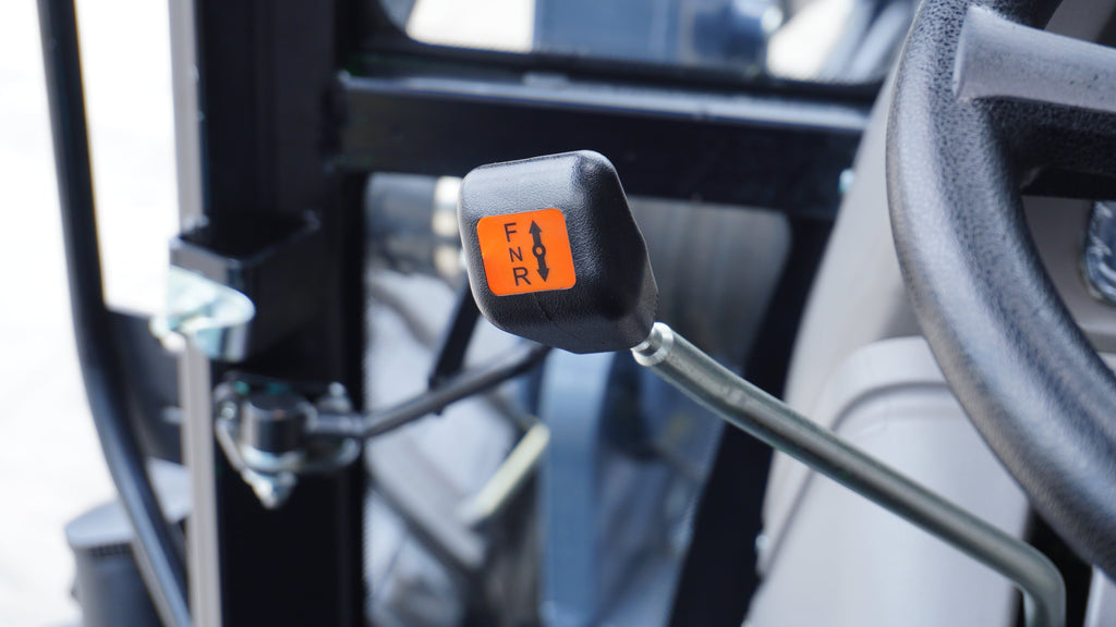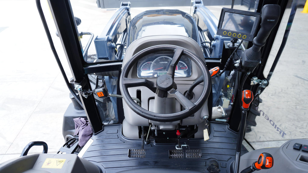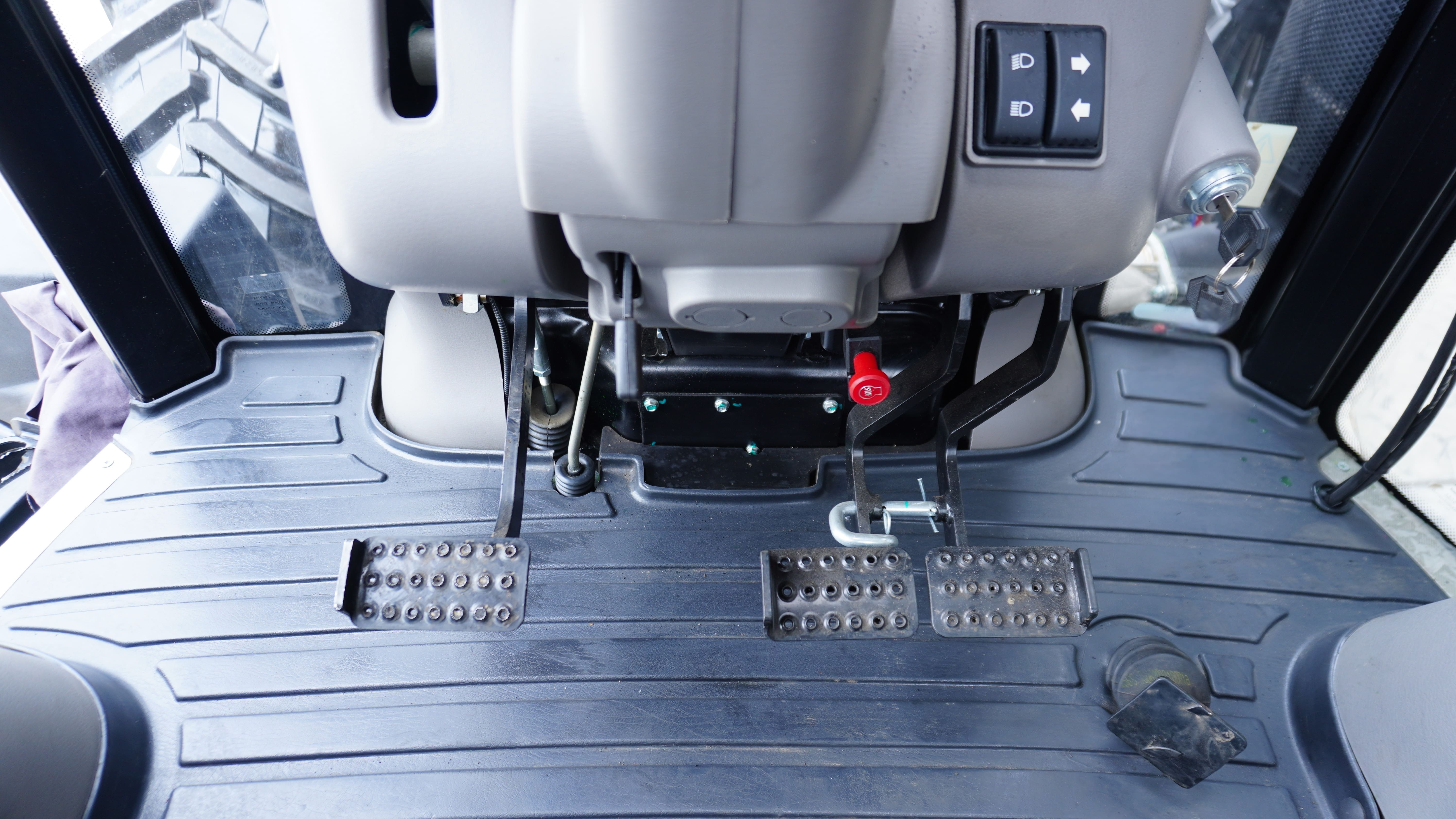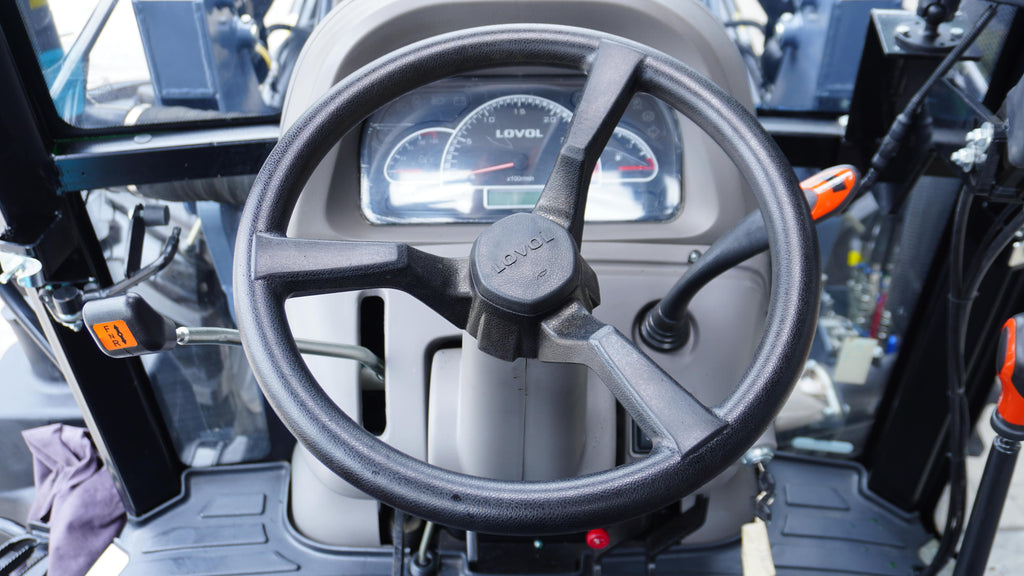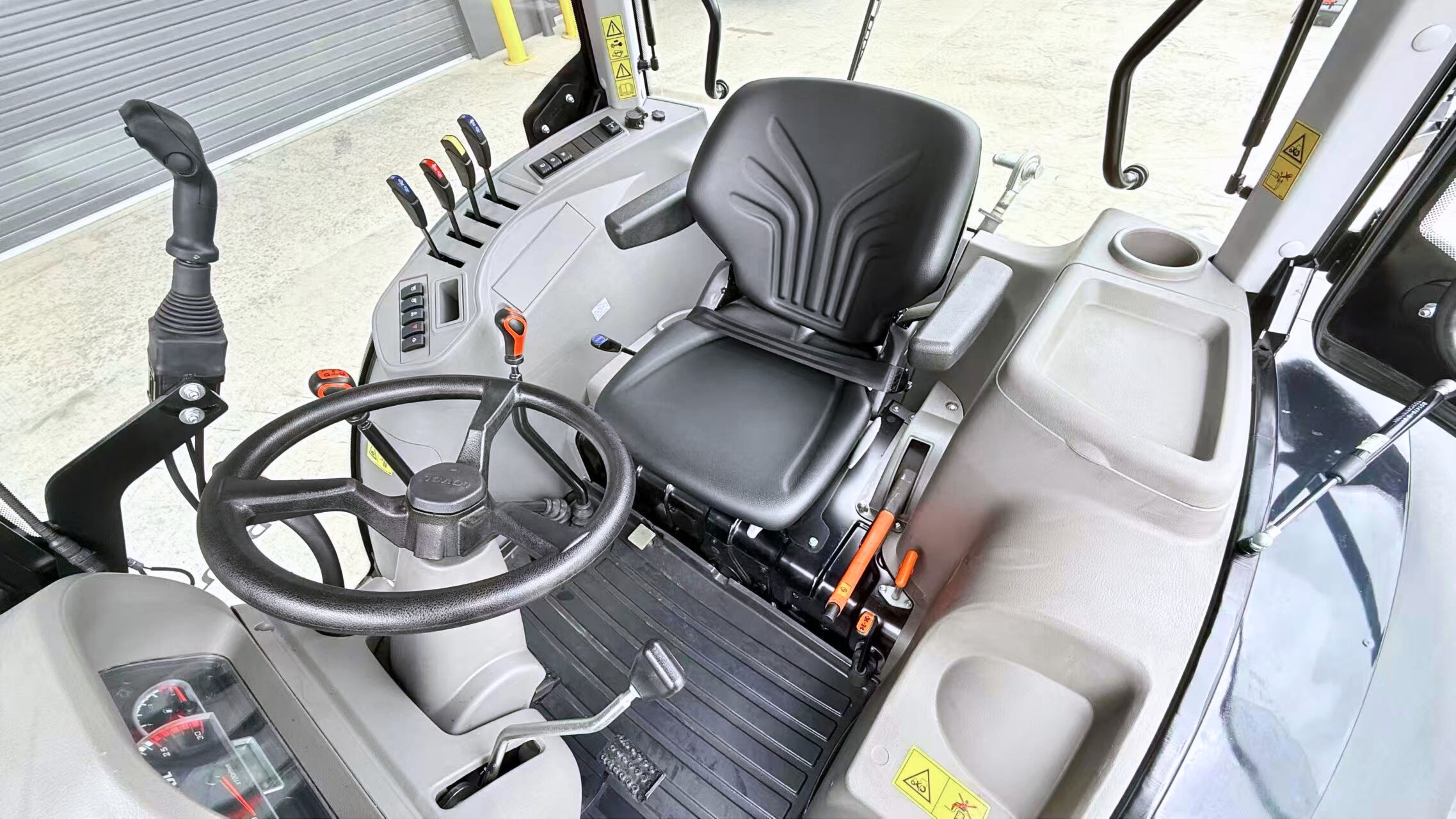 The steering wheel provides tilt and power steering, 12 forward and 12 reverse shuttle shifts, plus a hand throttle for precise speed control.
