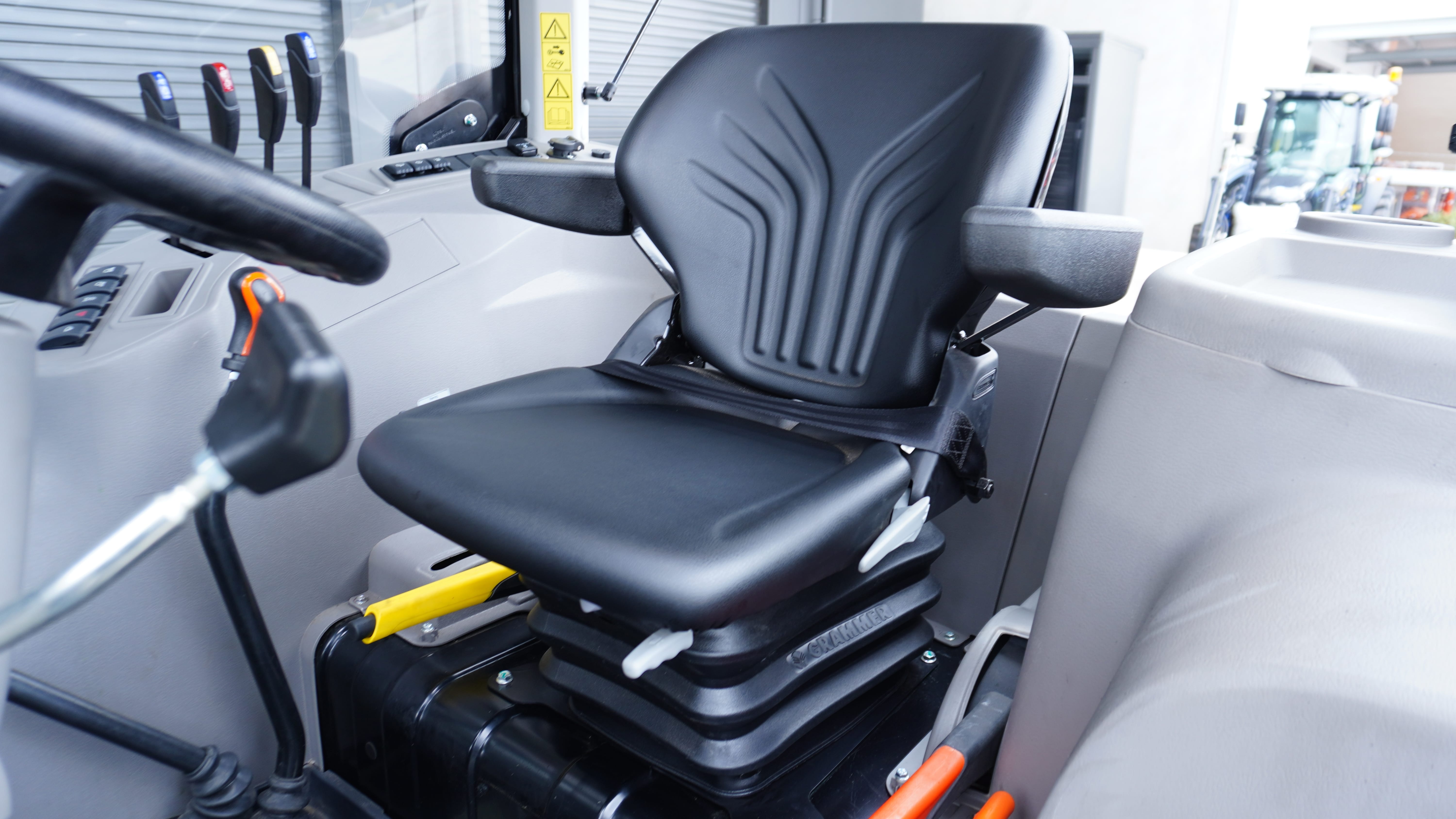 The adjustable Grammer suspension seat with a safety belt, armrests, and back storage provides comfort, safety, and convenient storage, ensuring a pleasant and secure driving experience.