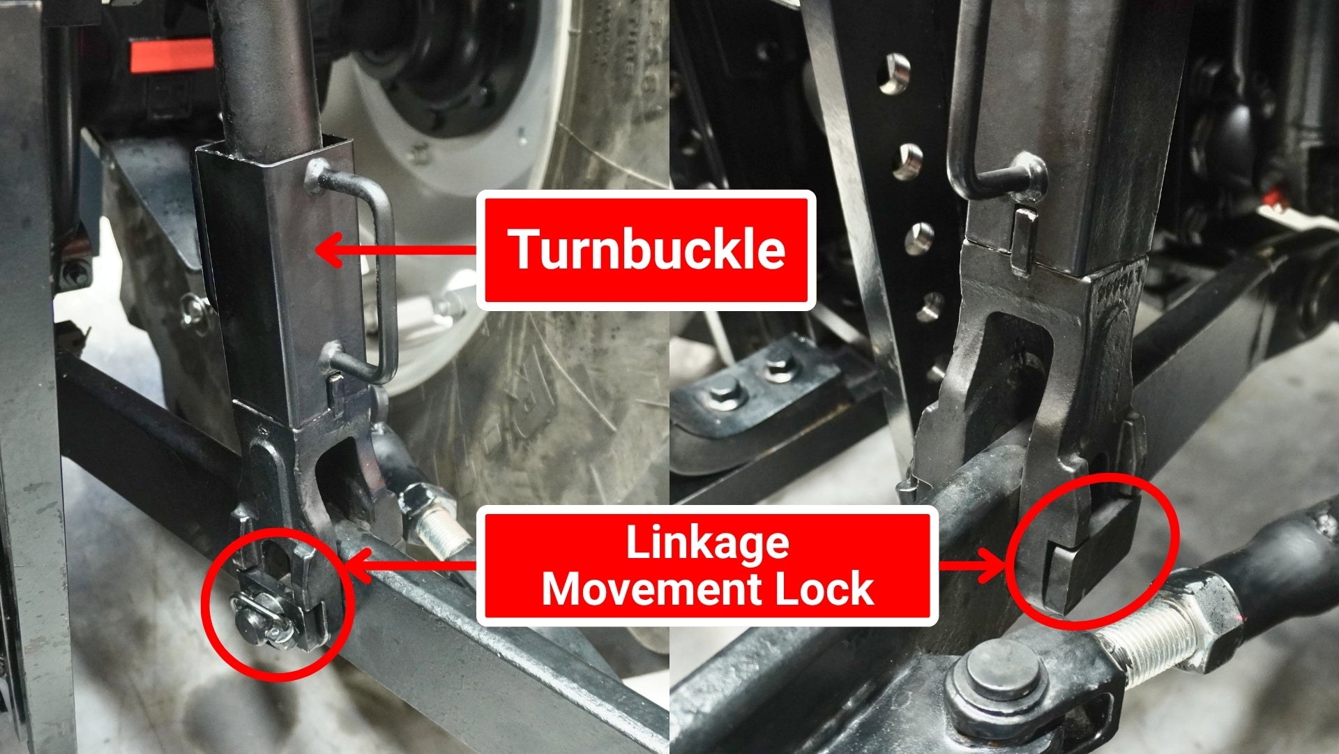 Rotate the Turnbuckle to lock or unlock the lifting rod for quick 3PL height adjustment. Remove the Linkage Movement Locks to allow the 3PL to move freely up and down, improving mechanical floating.
